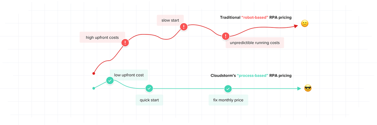 Compared with the traditional, "robot-based" RPA pricing our "process-based" pricing allows you to start with RPA faster and for a lower cost. As we use our own RPA technology, you don’t pay license fees, just a flat monthly price per process! In consequence, RPA will become a predictable & worry-free endeavor.